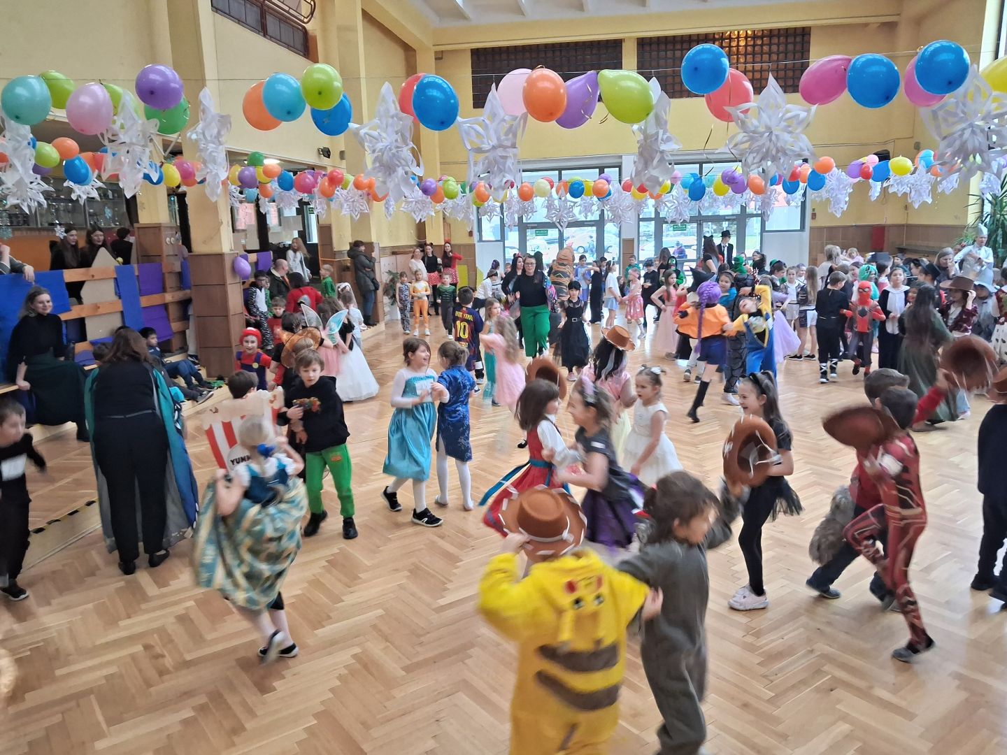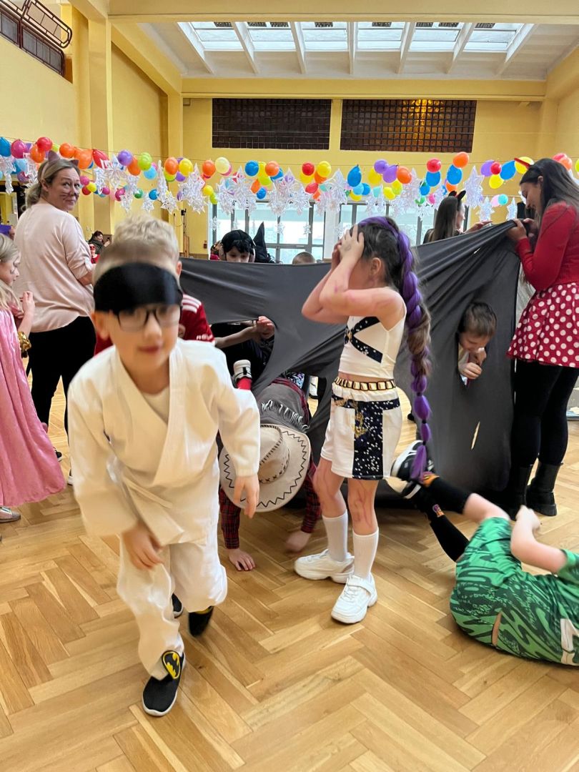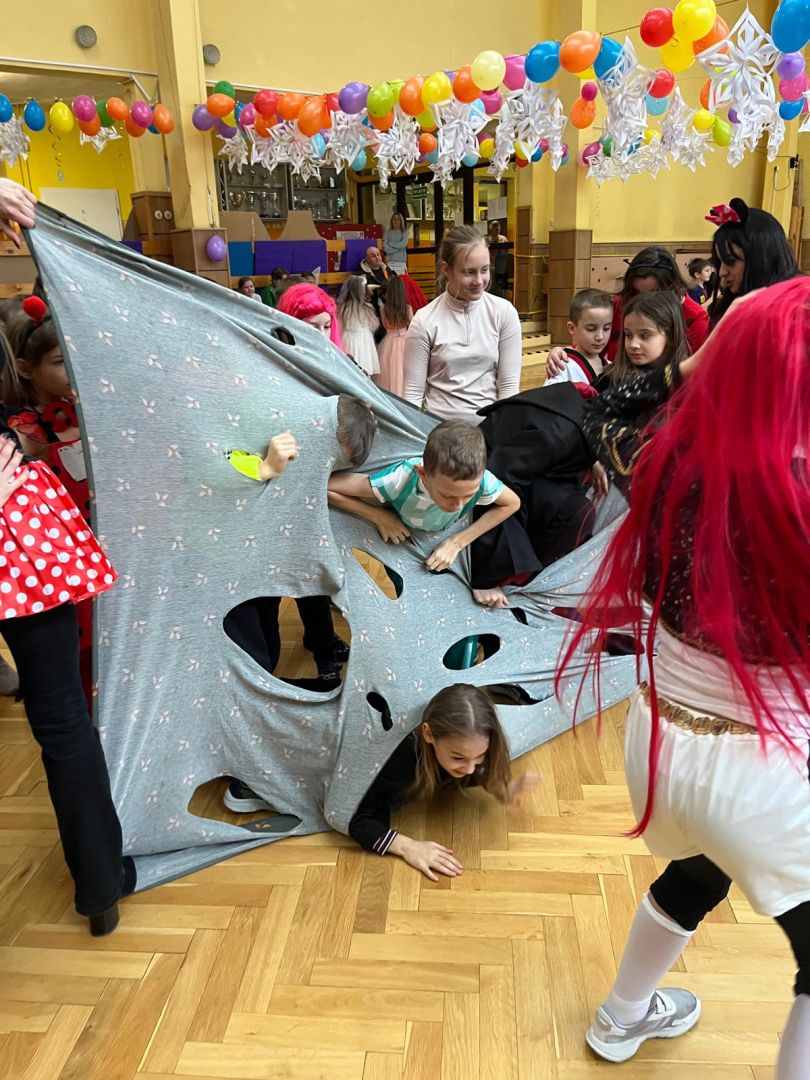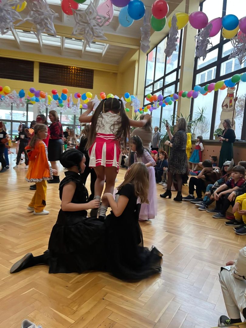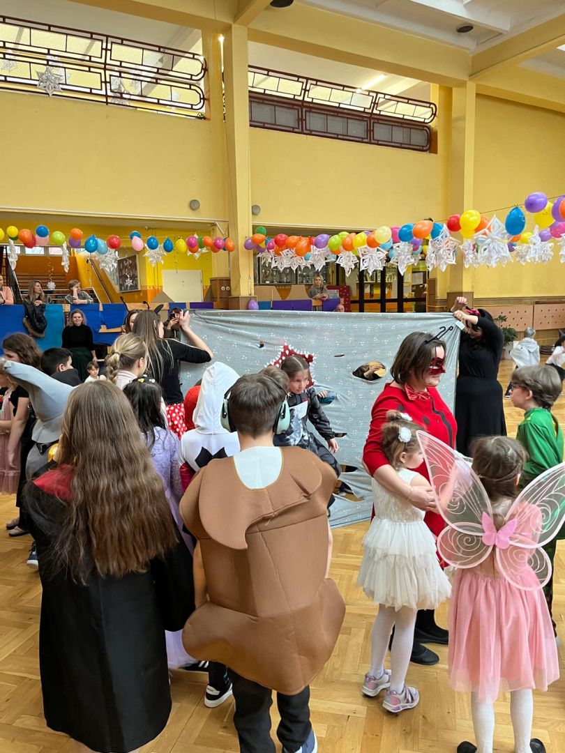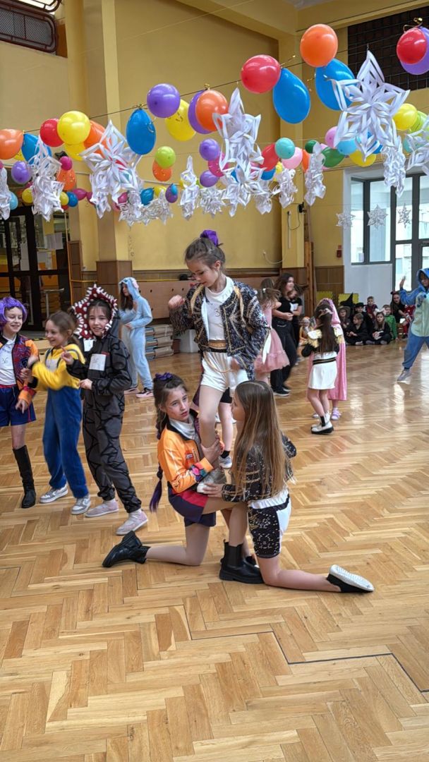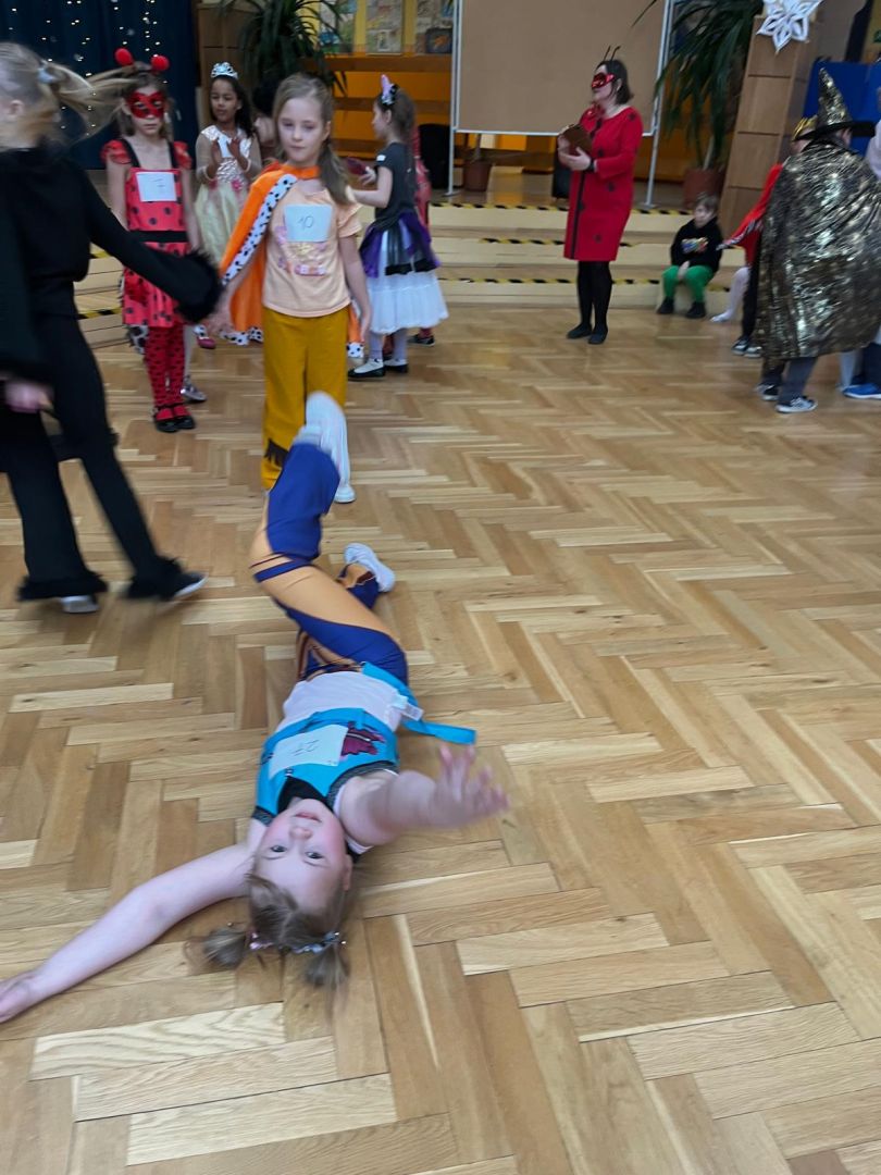 Dnia 30 stycznia 2026 r. Odbył się długo wyczekiwany bal karnawałowy dla uczniów w klas 1-3. Tego dnia szkolne forum zmieniło się w barwną, pełną dekoracji przestrzeń, która wprowadziła dzieci w radosny, karnawałowy nastrój. Uczniowie przybyli w kolorowych kostiumach przedstawiających bohaterów bajek, zwierząt, postacie fantastyczne oraz ulubionych superbohaterów. W trakcie zabawy dzieci uczestniczyły w licznych tańcach, zabawach i animacjach przygotowanych przez nauczycieli. Nie zabrakło konkursu "MISTRZ TAŃCA" który cieszył się dużym zainteresowaniem, wywołał dużo uśmiechów i pozwolił odktyć prawdziwe talenty. W przerwie na dzieci czekał‚ słodki poczęstunek oraz chwila odpoczynku. Bal dostarczył uczniom wielu pozytywnych emocji i był‚ doskonałą okazją do integracji oraz wspólnej, beztroskiej zabawy.
