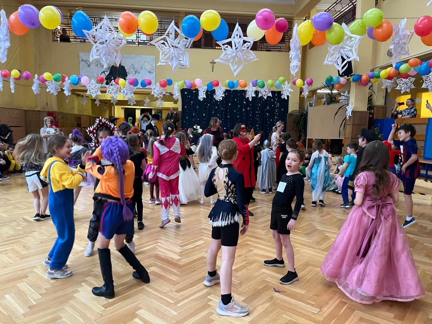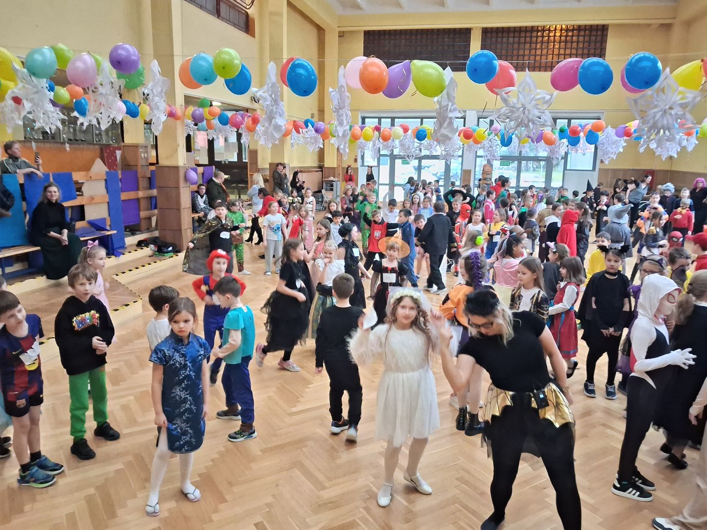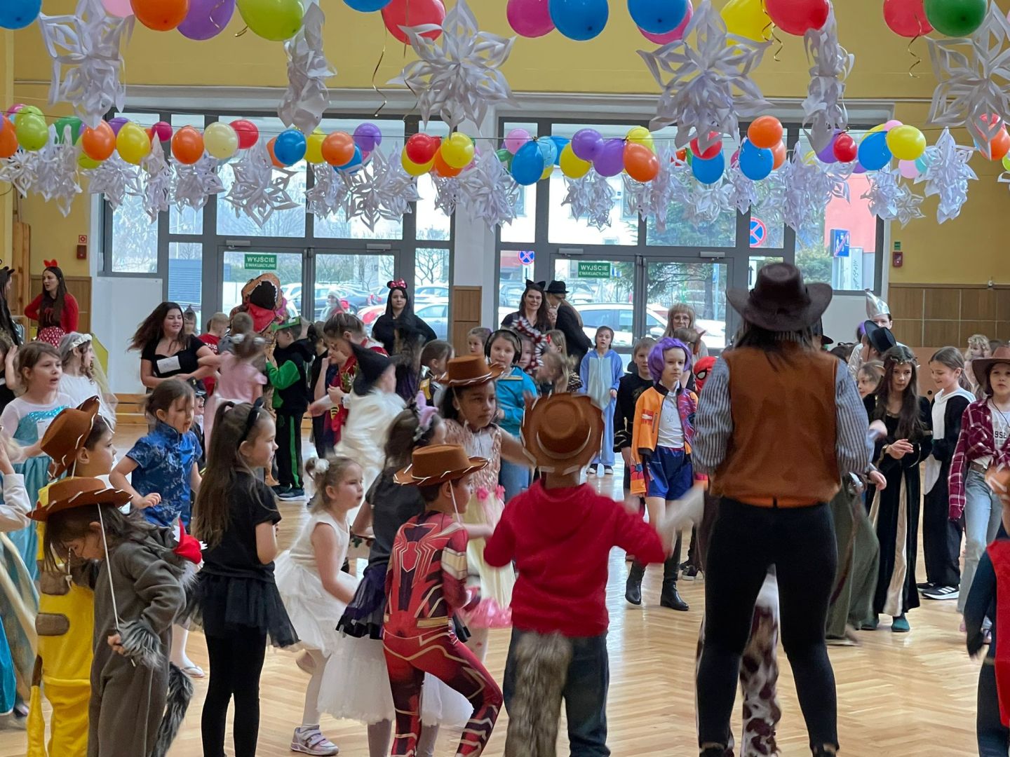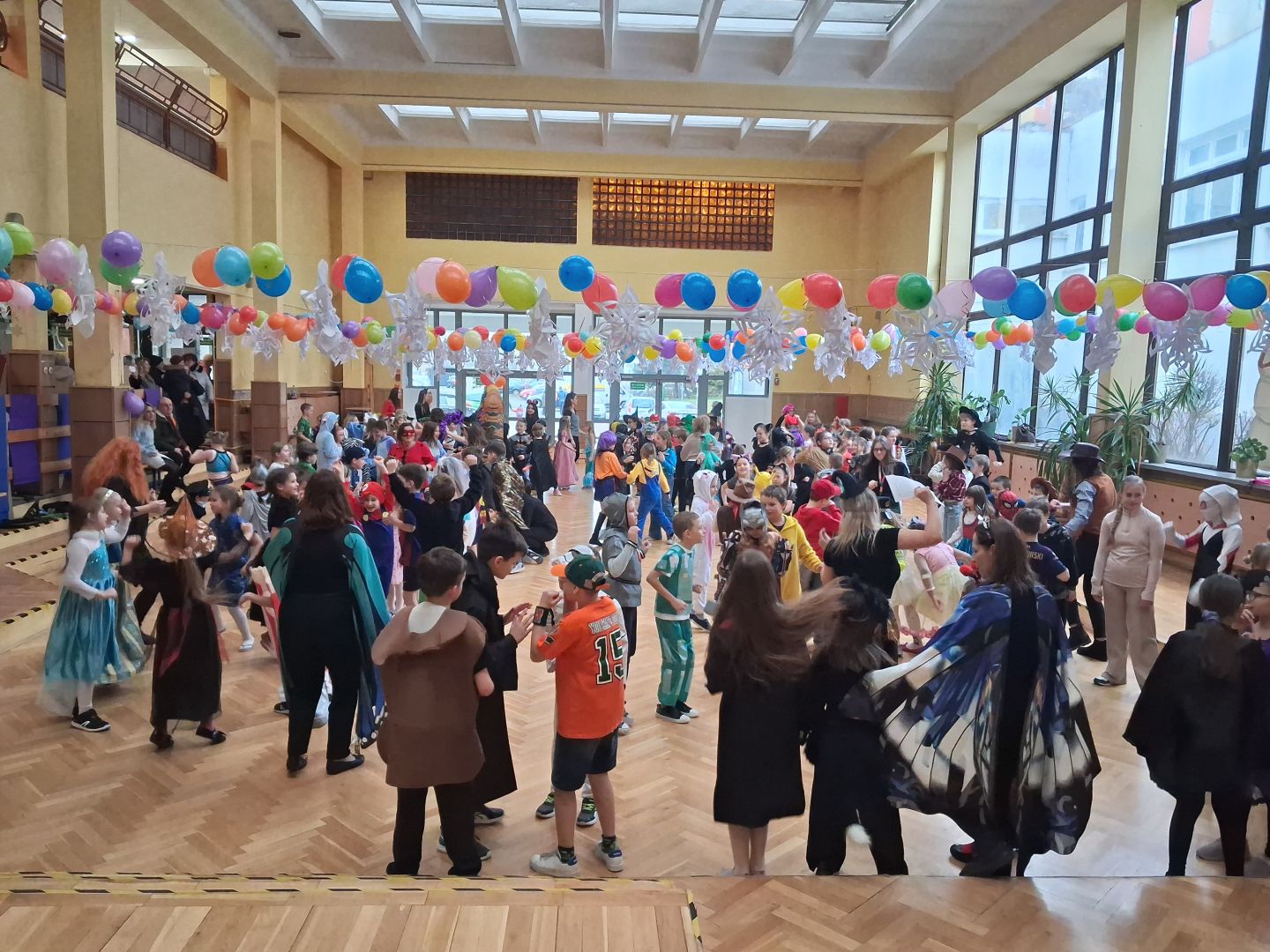 Dnia 30 stycznia 2026 r. Odbył się długo wyczekiwany bal karnawałowy dla uczniów w klas 1-3. Tego dnia szkolne forum zmieniło się w barwną, pełną dekoracji przestrzeń, która wprowadziła dzieci w radosny, karnawałowy nastrój. Uczniowie przybyli w kolorowych kostiumach przedstawiających bohaterów bajek, zwierząt, postacie fantastyczne oraz ulubionych superbohaterów. W trakcie zabawy dzieci uczestniczyły w licznych tańcach, zabawach i animacjach przygotowanych przez nauczycieli. Nie zabrakło konkursu "MISTRZ TAŃCA" który cieszył się dużym zainteresowaniem, wywołał dużo uśmiechów i pozwolił odktyć prawdziwe talenty. W przerwie na dzieci czekał‚ słodki poczęstunek oraz chwila odpoczynku. Bal dostarczył uczniom wielu pozytywnych emocji i był‚ doskonałą okazją do integracji oraz wspólnej, beztroskiej zabawy.