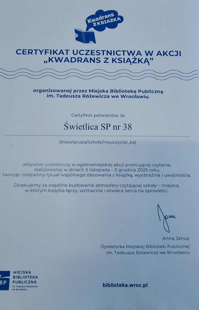 Certyfikat potwierdzający udział w akcji “Kwadrans z książką”.