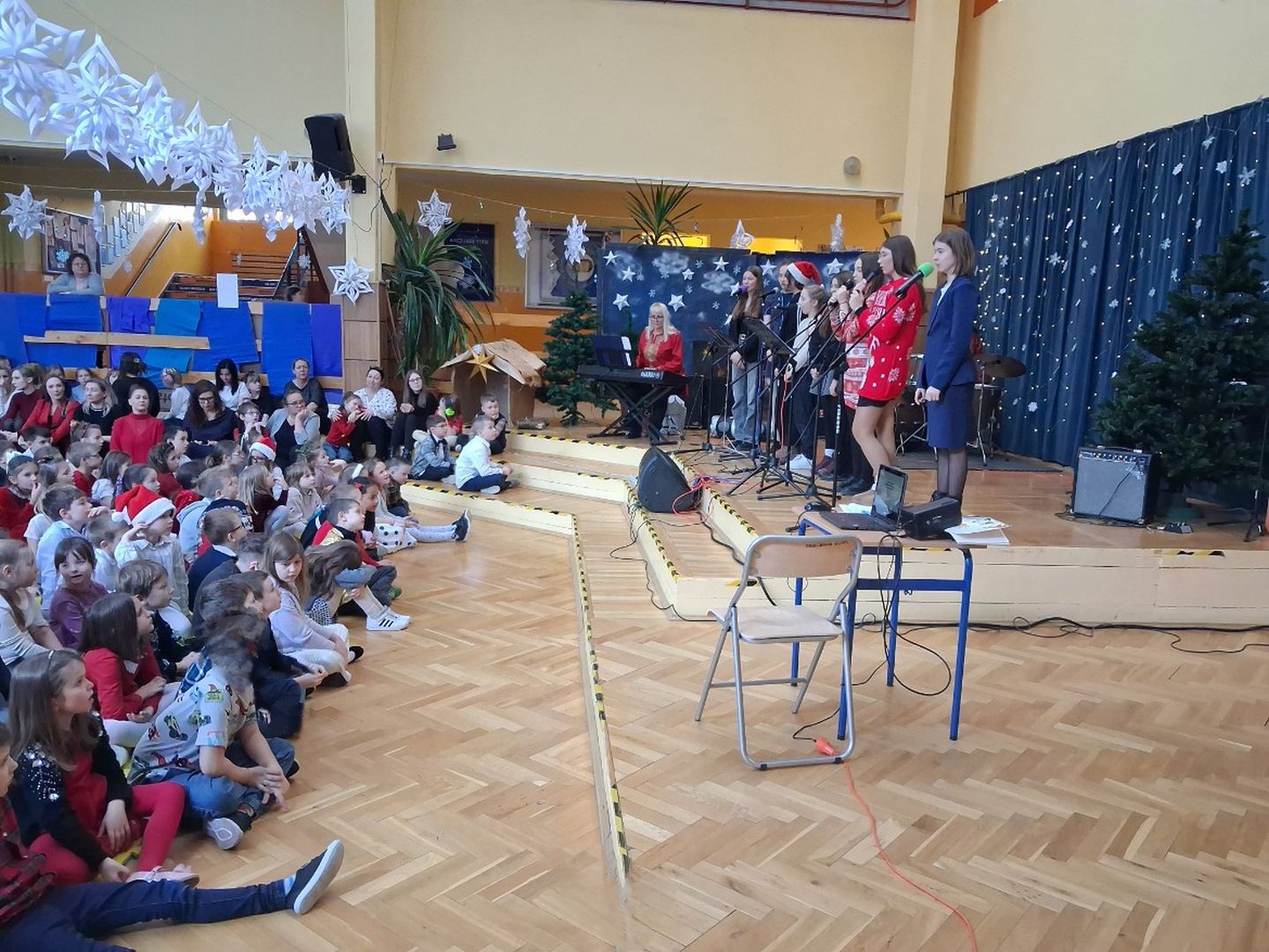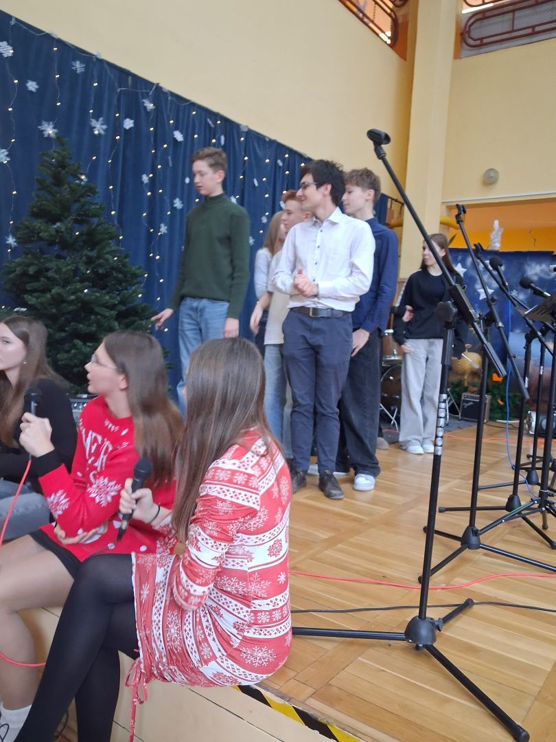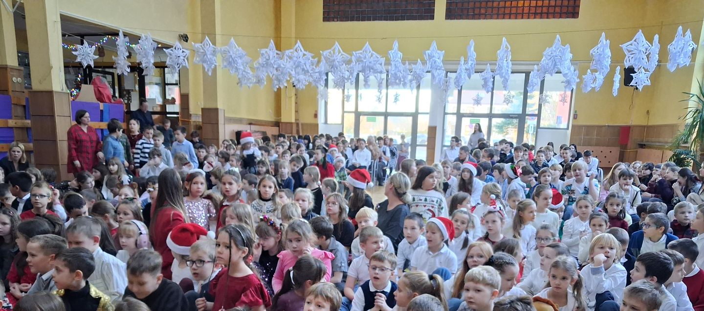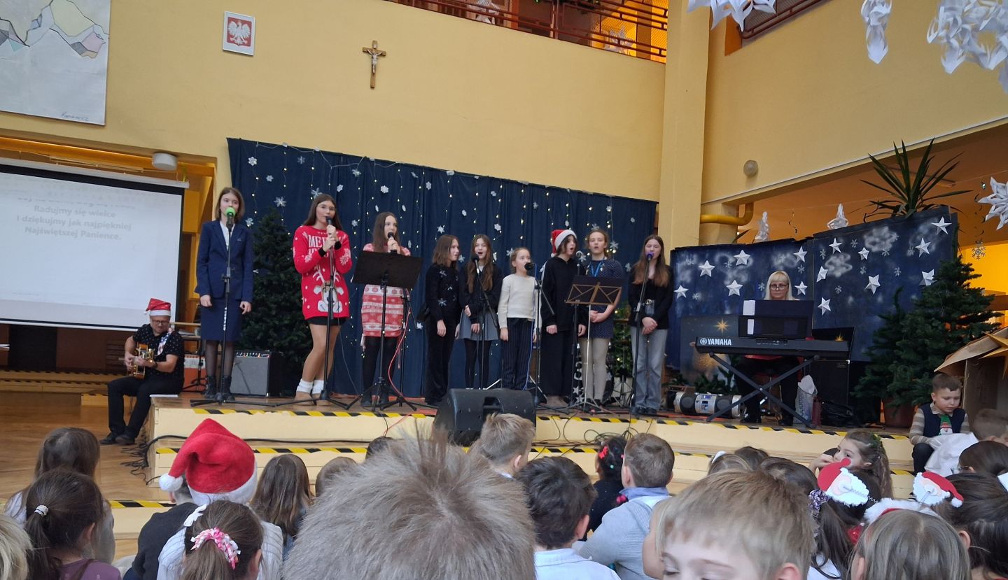 Tuż przed świętami cała szkolna społeczność wspólnie śpiewała i radowała się na szkolnym forum. Uczniowie wszystkich klas przygotowali pastorałki a przygrywali im nauczyciele: Anna Pasek-keyboard, Kinga Sobolewska-perkusja oraz Piotr Słaby- gitara. Kolędę solo zaśpiewała Zuzia Ch. uczennica klasy 3b a szkolny zespół muzyczny zaśpiewał świąteczne przeboje w języku angielskim. To był piękny koncert.