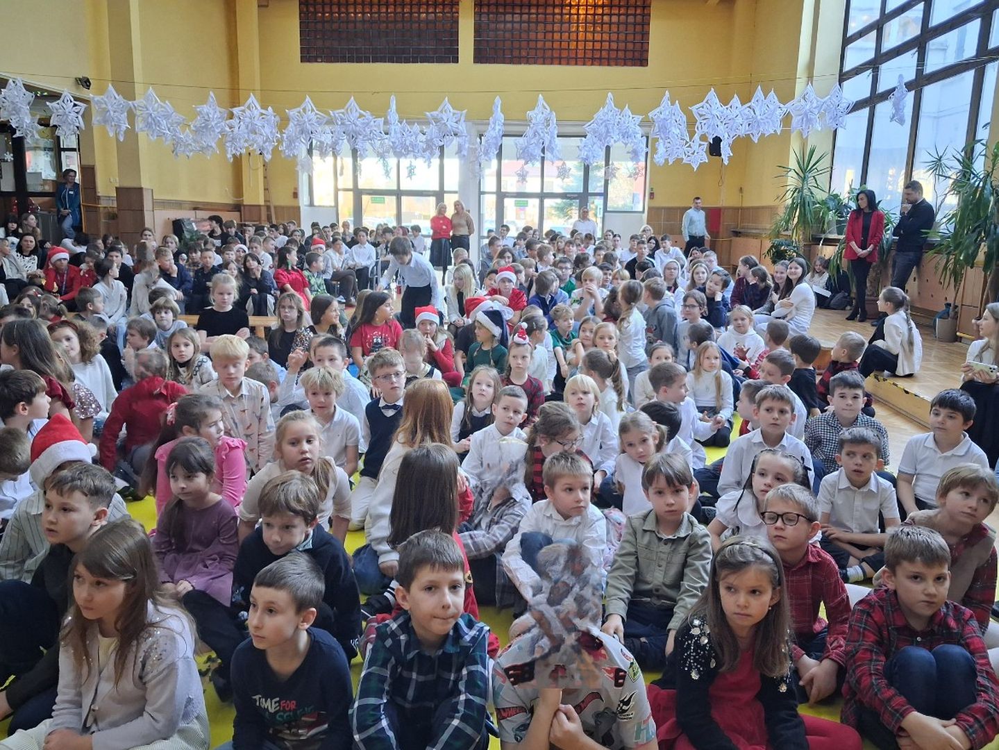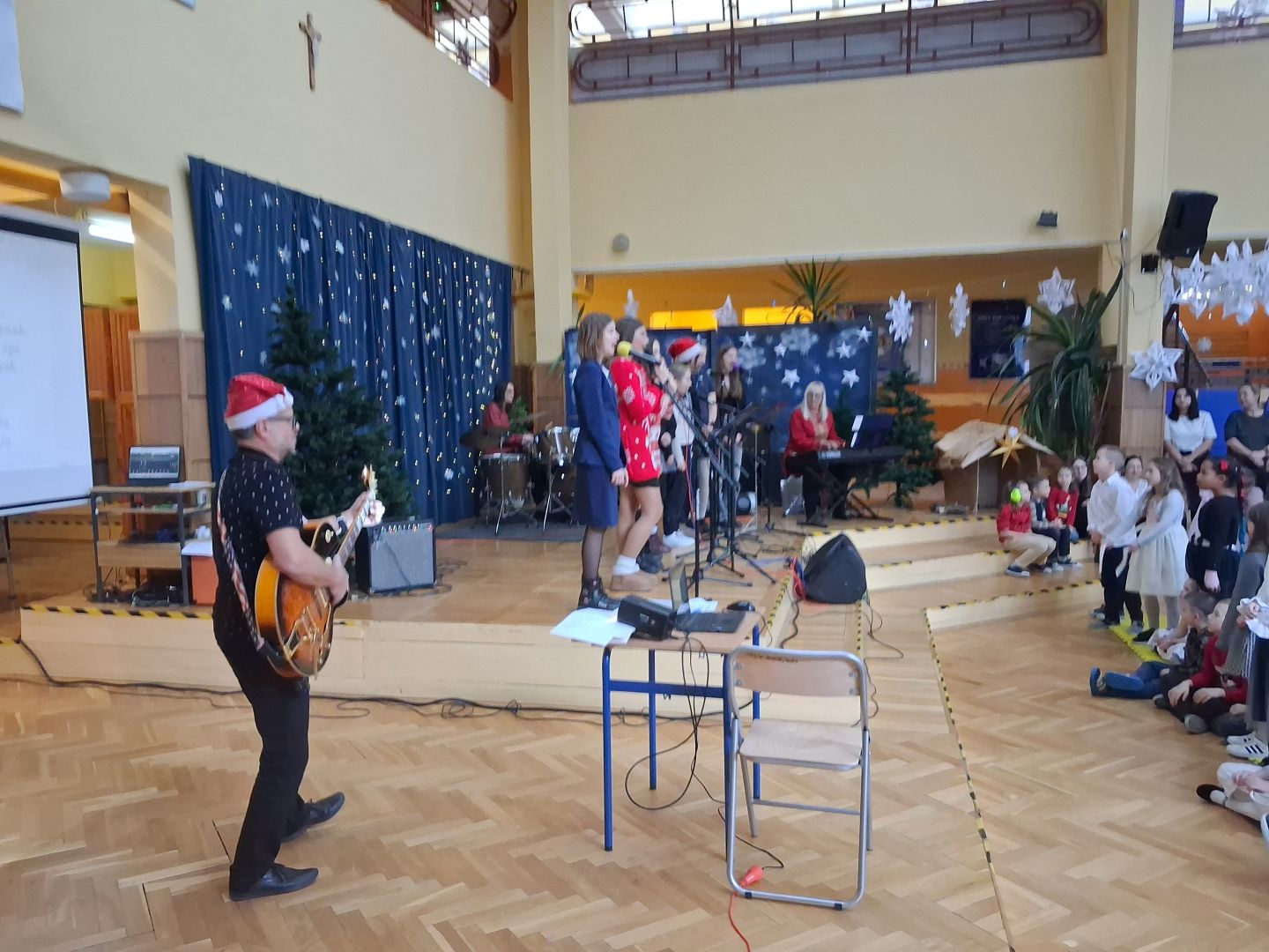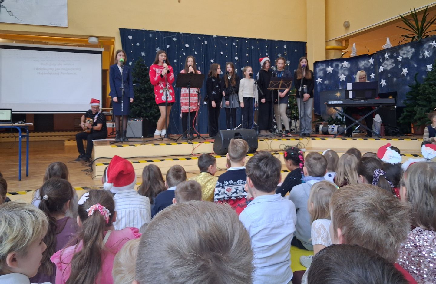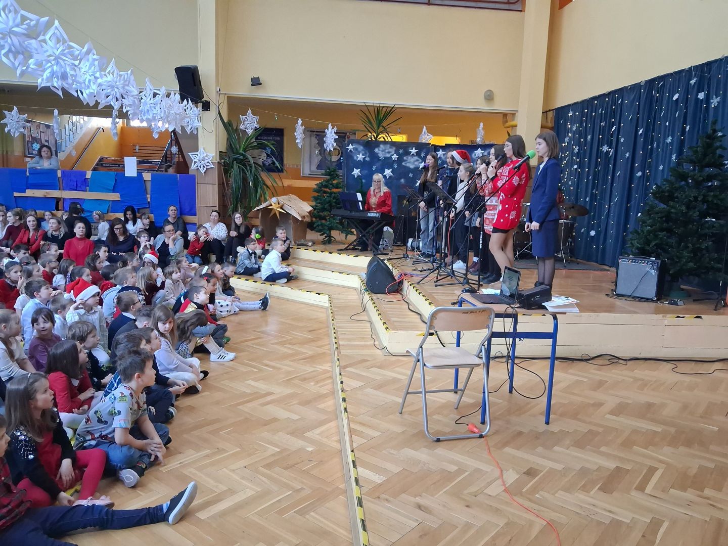 Tuż przed świętami cała szkolna społeczność wspólnie śpiewała i radowała się na szkolnym forum. Uczniowie wszystkich klas przygotowali pastorałki a przygrywali im nauczyciele: Anna Pasek-keyboard, Kinga Sobolewska-perkusja oraz Piotr Słaby- gitara. Kolędę solo zaśpiewała Zuzia Ch. uczennica klasy 3b a szkolny zespół muzyczny zaśpiewał świąteczne przeboje w języku angielskim. To był piękny koncert.