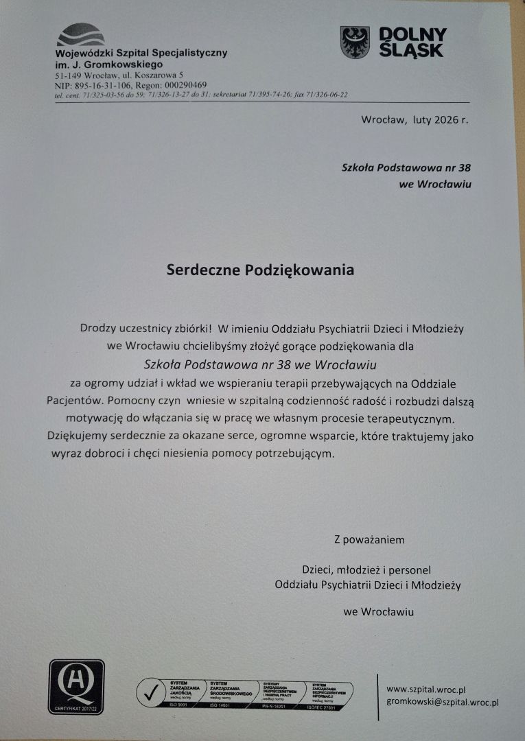 Serdecznie dziękujemy wszystkim uczniom, którzy zaangażowali sięw zbiórkę pluszaków dla pacjentów Oddziału Psychiatrii Dzieci i Młodzieży. Dzięki Waszej otwartości, życzliwości i gotowości niesienia pomocy, podarowaliśmy pacjentom coś więcej niż tylko maskotki - podarowaliśmy im uśmiech, poczucie bezpieczeństwa oraz chwilę radości w trudnym czasie hospitalizacji.