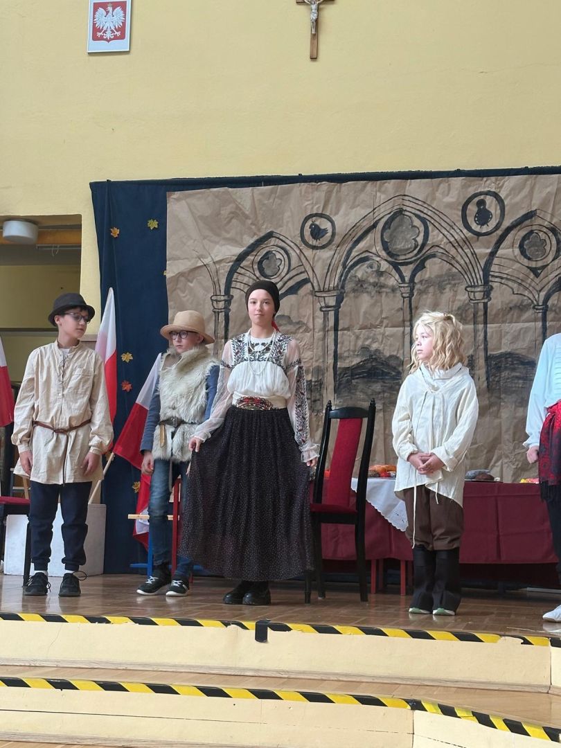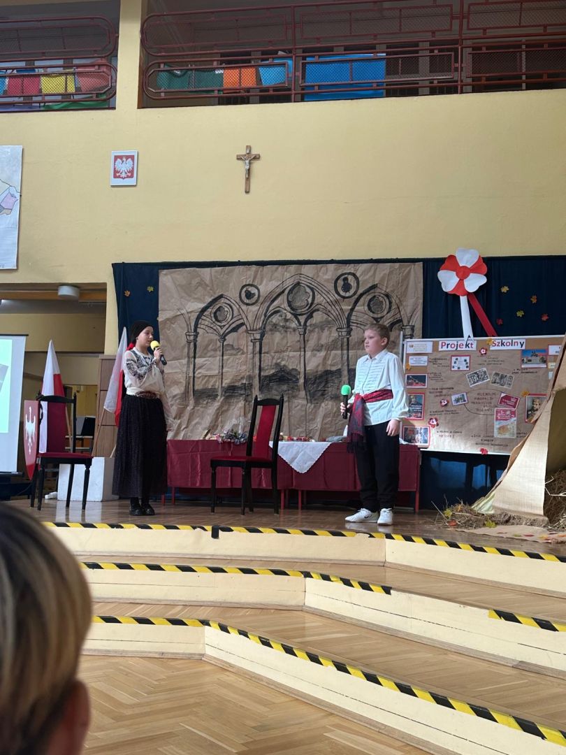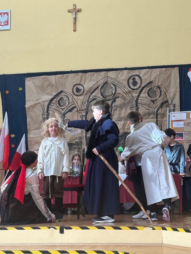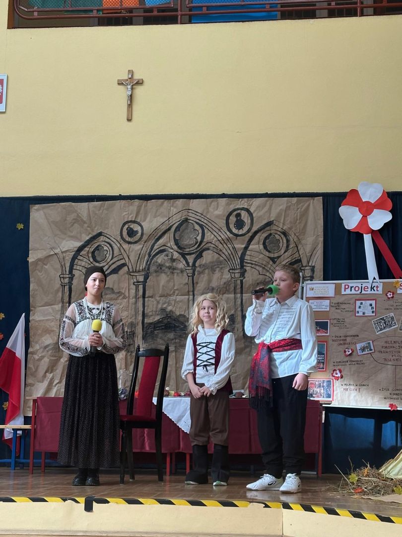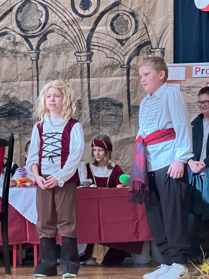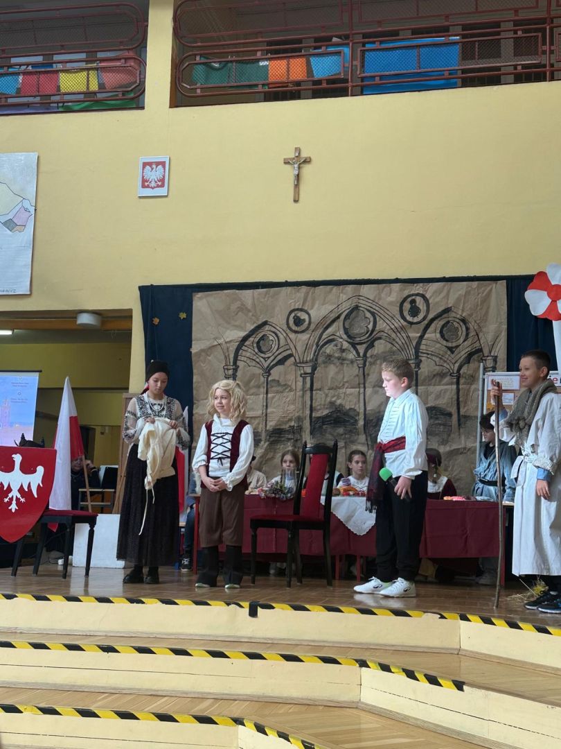 Uroczyste podsumowanie realizowanego w naszej szkole projektu “Milenium Koronacji Pierwszych Królów Polski”. Uczniowie z ciekawością obejrzeli przygotowane inscenizacje zwyczaju postrzyżyn i zaplecin. Z uwagą wysłuchali wykładu Pana Macieja oraz obejrzeli tradycyjne średniowieczne tańce. Program był bardzo interesujący a aktorzy wyglądali zjawiskowo.
