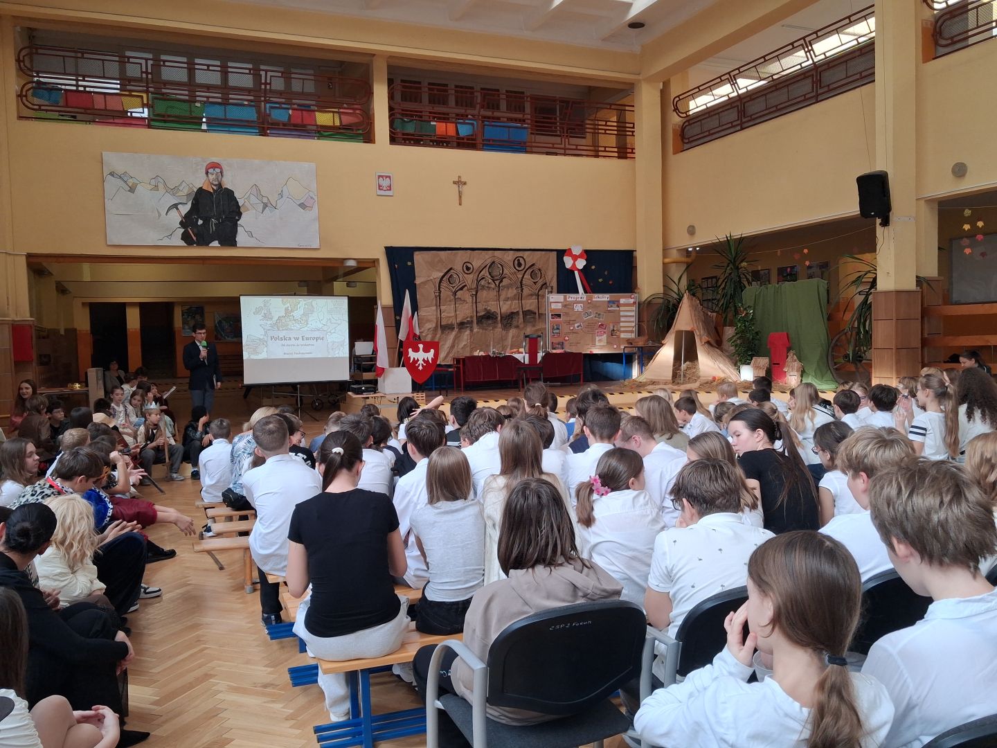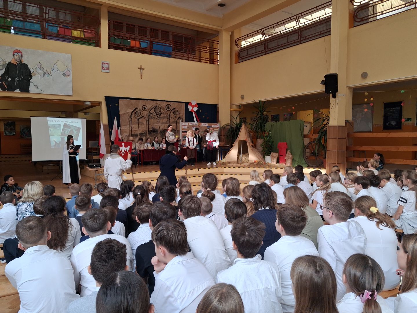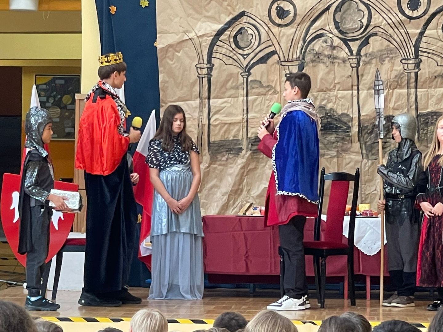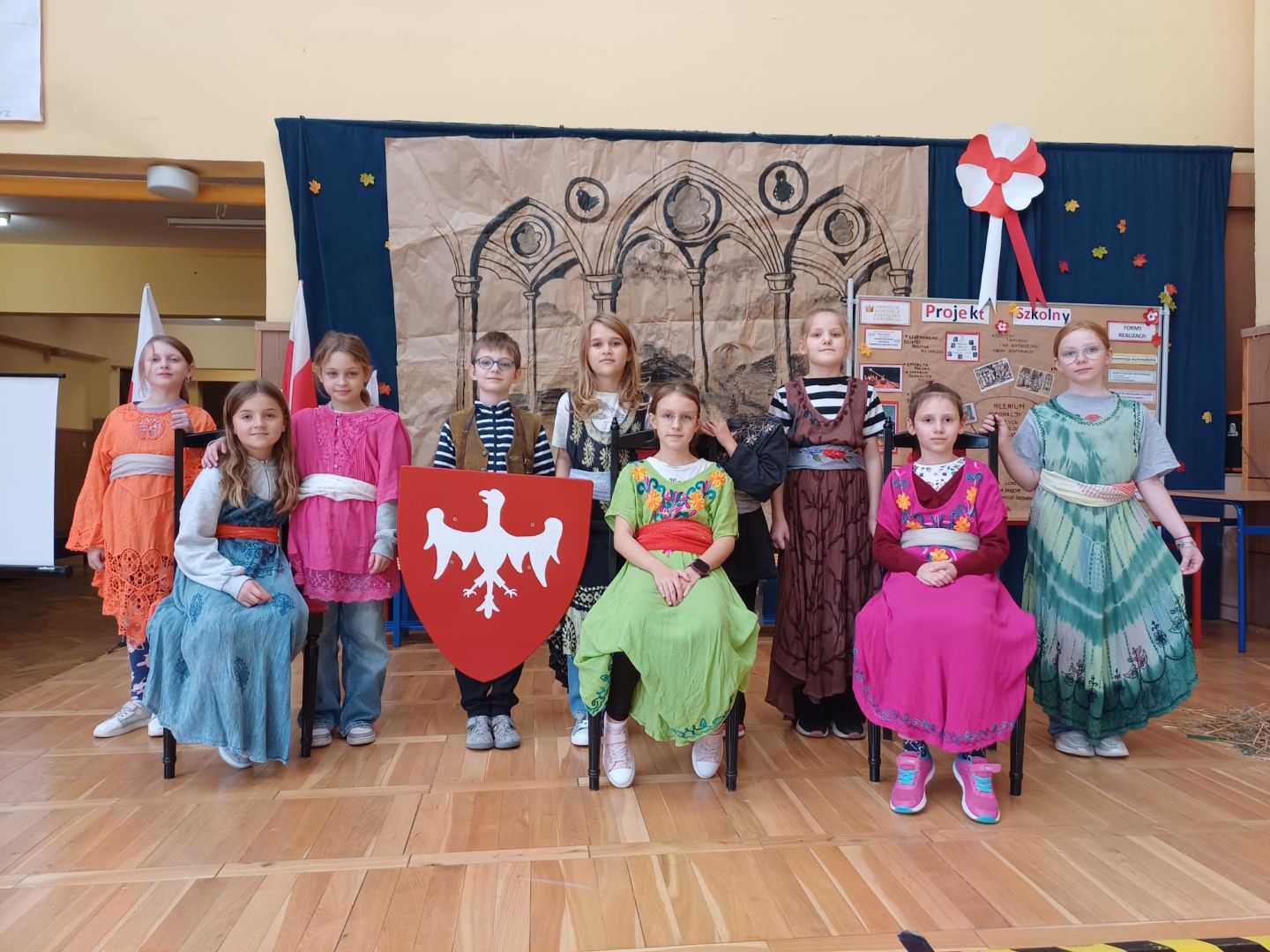 Uroczyste podsumowanie realizowanego w naszej szkole projektu “Milenium Koronacji Pierwszych Królów Polski”. Uczniowie z ciekawością obejrzeli przygotowane inscenizacje zwyczaju postrzyżyn i zaplecin. Z uwagą wysłuchali wykładu Pana Macieja oraz obejrzeli tradycyjne średniowieczne tańce. Program był bardzo interesujący a aktorzy wyglądali zjawiskowo.