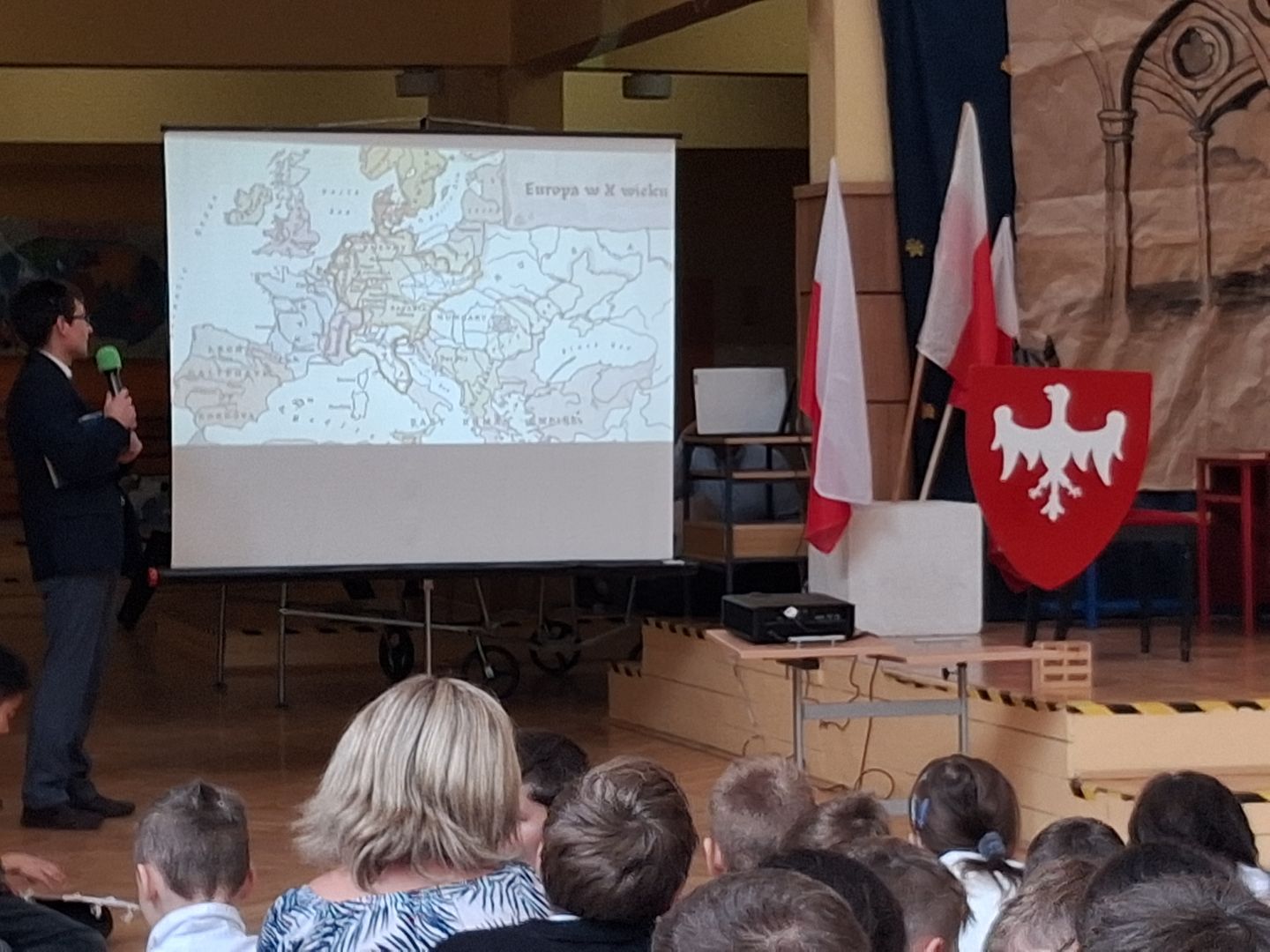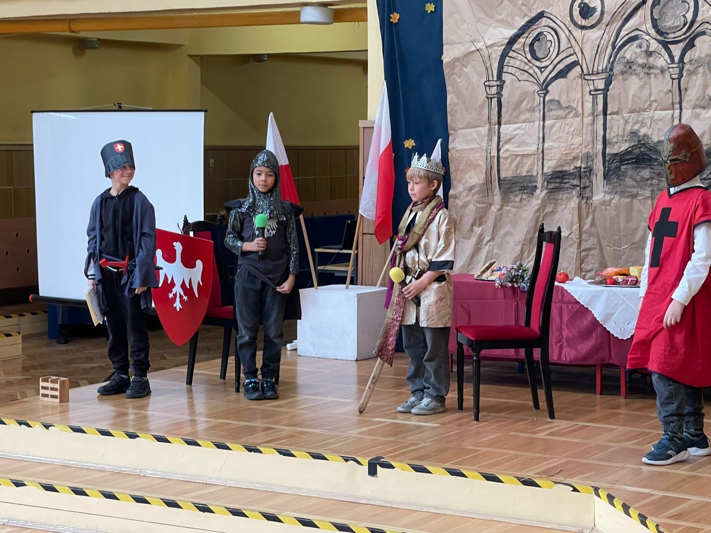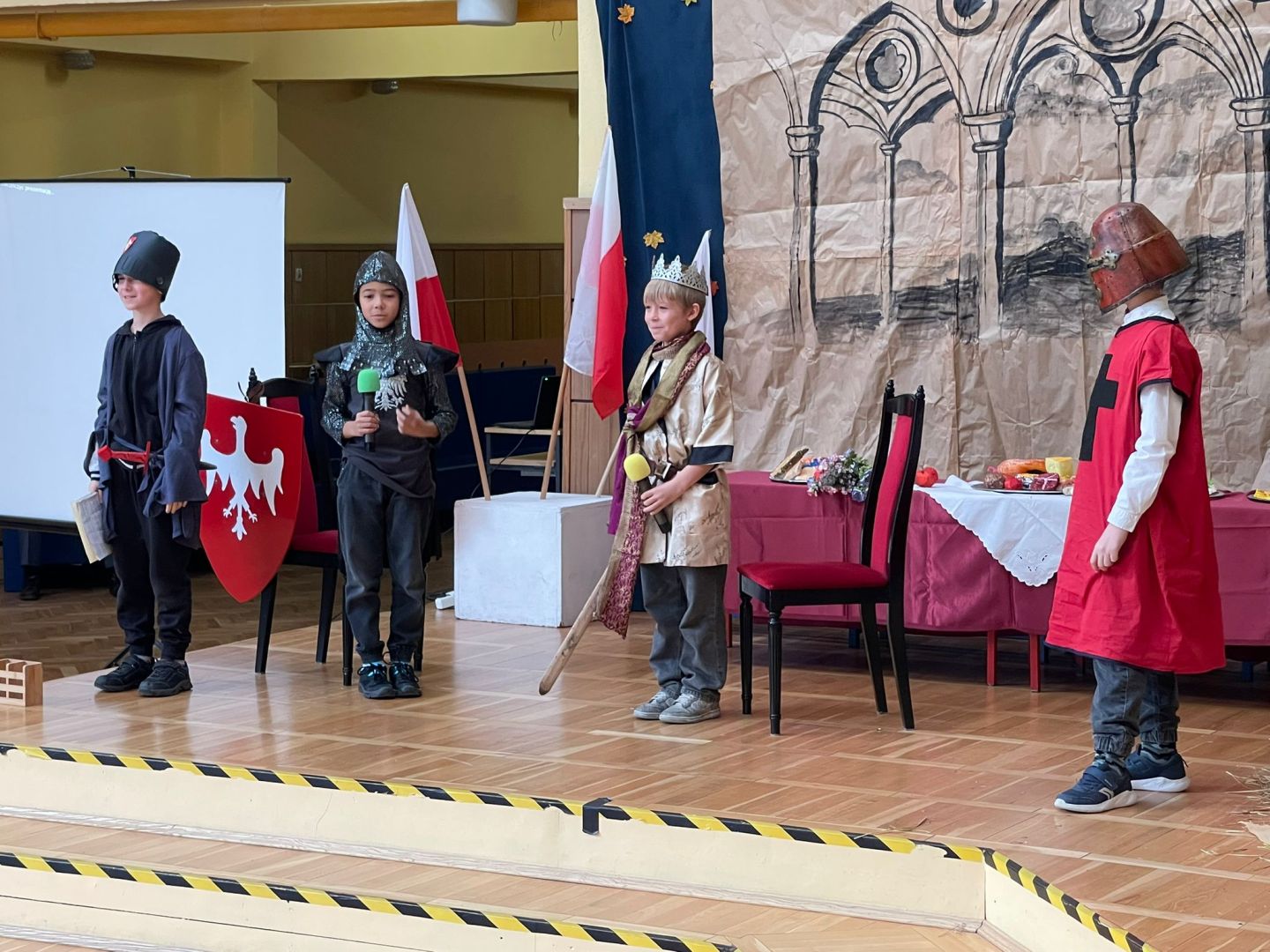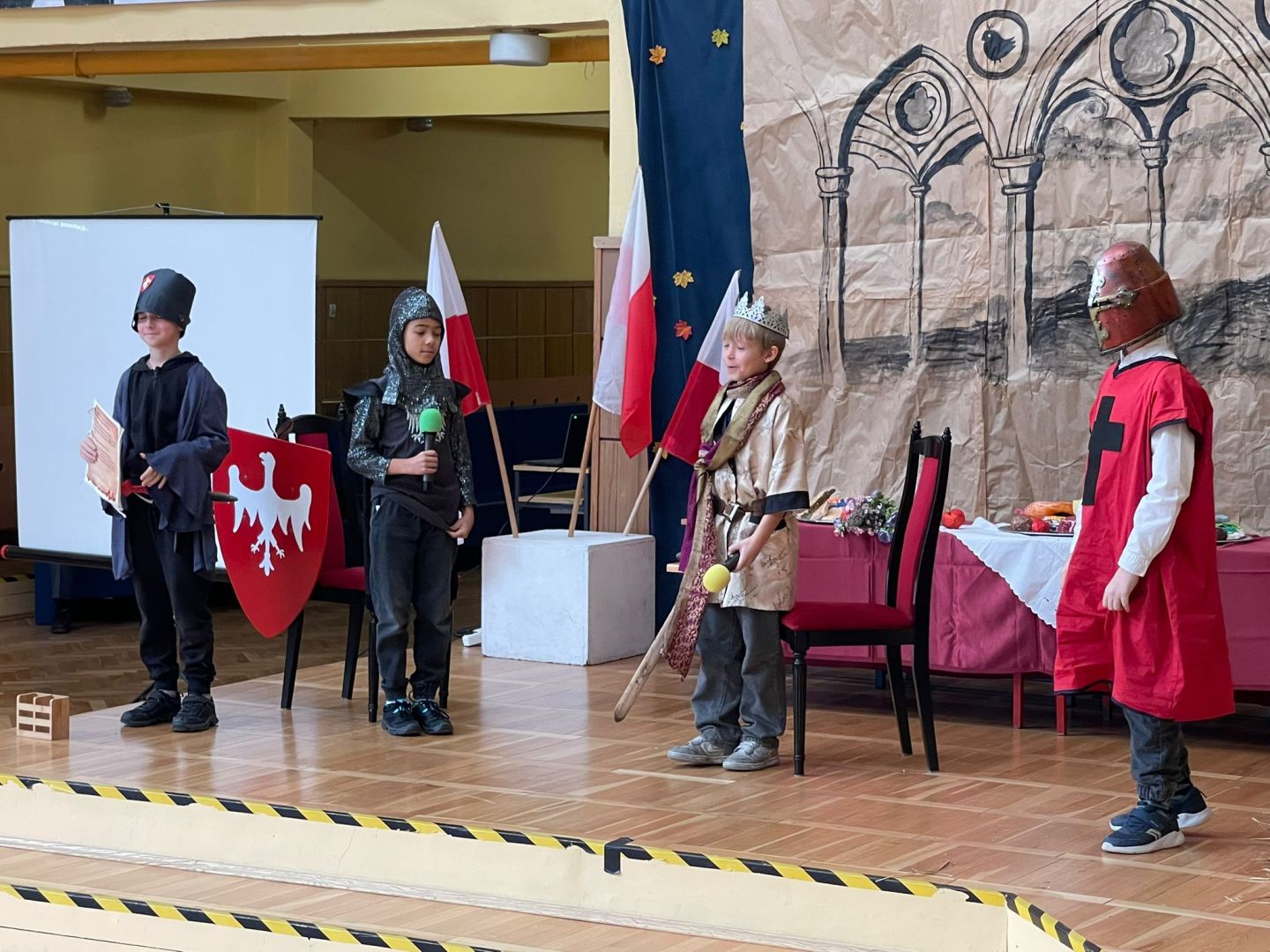 Uroczyste podsumowanie realizowanego w naszej szkole projektu “Milenium Koronacji Pierwszych Królów Polski”. Uczniowie z ciekawością obejrzeli przygotowane inscenizacje zwyczaju postrzyżyn i zaplecin. Z uwagą wysłuchali wykładu Pana Macieja oraz obejrzeli tradycyjne średniowieczne tańce. Program był bardzo interesujący a aktorzy wyglądali zjawiskowo.