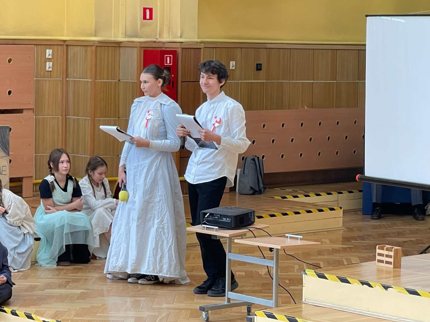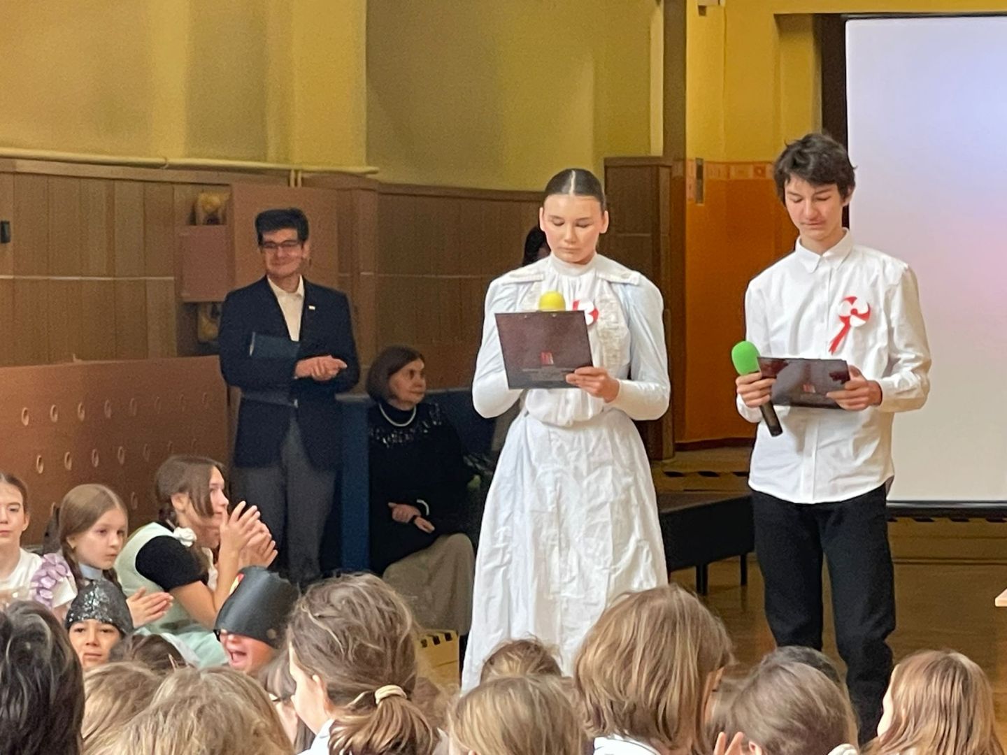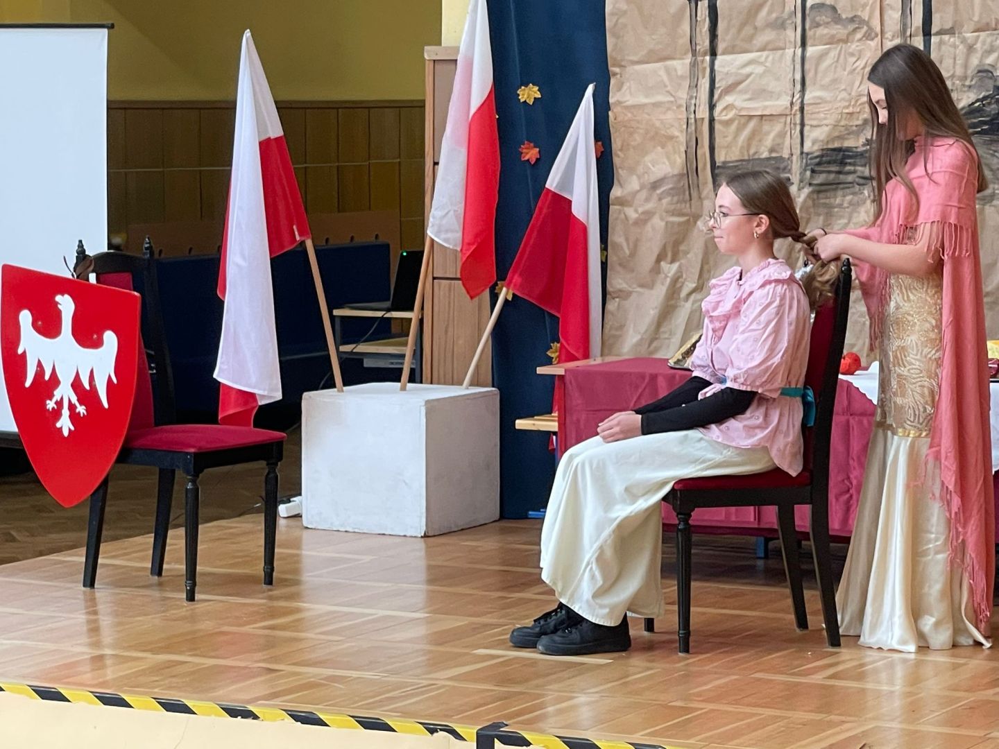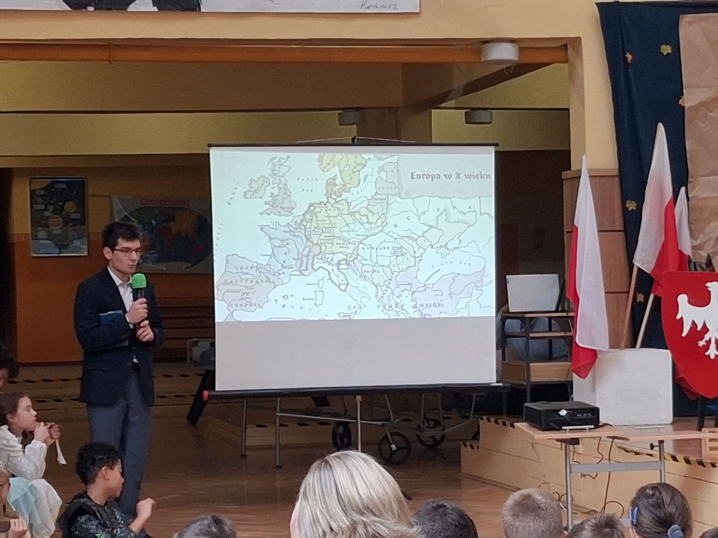 Uroczyste podsumowanie realizowanego w naszej szkole projektu “Milenium Koronacji Pierwszych Królów Polski”. Uczniowie z ciekawością obejrzeli przygotowane inscenizacje zwyczaju postrzyżyn i zaplecin. Z uwagą wysłuchali wykładu Pana Macieja oraz obejrzeli tradycyjne średniowieczne tańce. Program był bardzo interesujący a aktorzy wyglądali zjawiskowo.